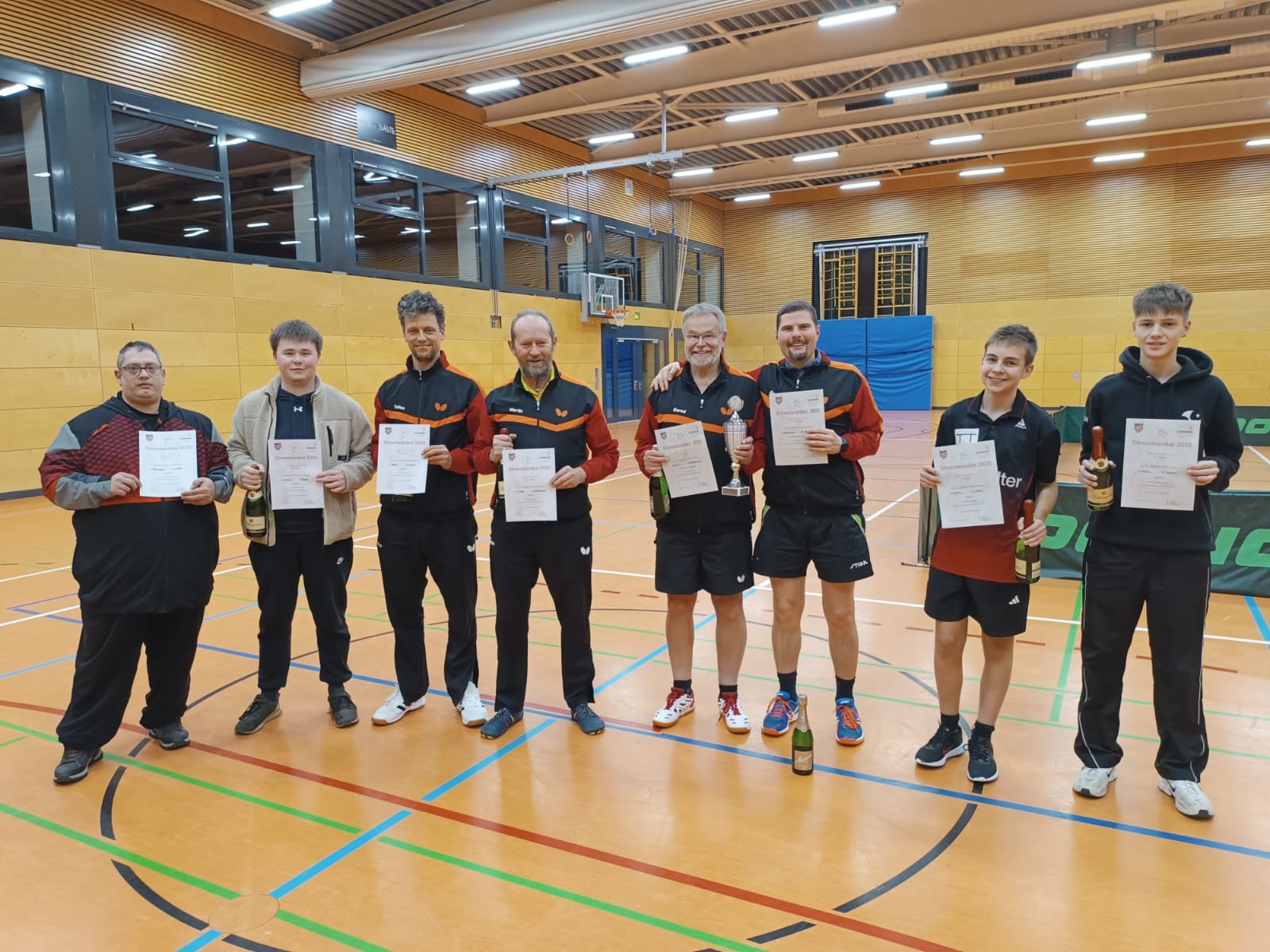 Silvesterpokal 2025 Auch 2025 fand wieder unser alljährlicher Tischtennis Silvesterpokal statt. Wir trafen uns am Dienstag, 30.12.25 abends in der Mühlbachhalle, um diesen beliebten internen Pokal auszuspielen. Insgesamt waren sieben 2er-Teams am Start, so dass wir mit einer 4er-Gruppe und einer 3er-Gruppe in den Wettbewerb starteten. In den Gruppenspielen mit jeweils zwei Einzeln und einem Doppel wurden die Halbfinalisten ermittelt. Aus dem ersten Halbfinale Martin/Damir gegen Felix/Lenny gingen Felix/Lenny mit einem 2:0 als Sieger hervor und standen somit im Finale. Im zweiten Halbfinale standen sich Tobias/Nick dem Duo Bernd/Andi R. gegenüber. Hier ging es etwas knapper zu, wobei Bernd/Andi letztlich mit 2:1 Sätzen ins Finale einziehen konnten. In einem spannenden Finale und bereits nach Mitternacht ging dann der Silvesterpokal zu Ende und Bernd/Andi konnten sich als Sieger feiern lassen. Alle Teilnehmer und Gäste freuten sich dann auf die leckere Gulaschsuppe von Joachim zum Abschluss des Silvesterpokals und bei einem gemütlichen Kaltgetränk ließen wir dann den Silvesterpokal 2025 ausklingen.